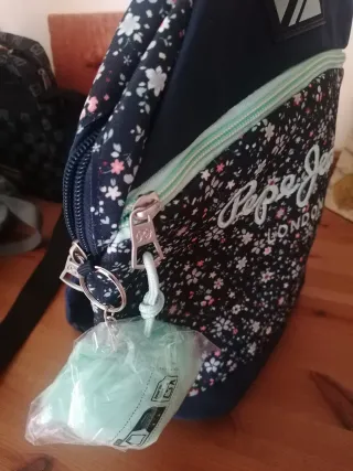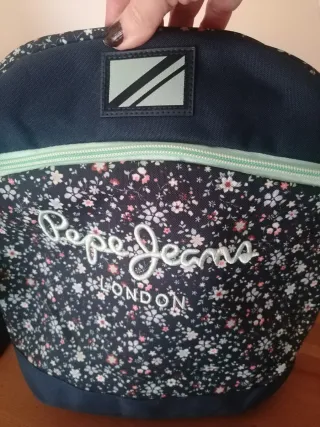 Mochila de la marca Pepe Jeans con un diseño juvenil. - Color azul vaquero. - Detalle de corazón rojo con la palabra Bright. - Logo de Pepe Jeans London bordado en blanco. EN PERFECTO ESTADO NUEVA CON ETIQUETA