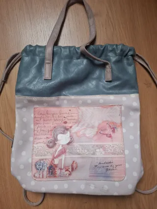 Bolso tipo mochila con un diseño único y juvenil. En muy buen estado. - Cierre fruncido superior. - Bolsillo exterior con cremallera. - Estampado de estilo vintage con escena urbana.
