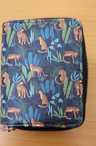 Cartera o monedero con un llamativo estampado de jungla y leopardos. Es un accesorio juvenil y práctico. - Diseño con fondo azul oscuro. - Estampado de hojas verdes y figuras de leopardos. - Cierre de cremallera.