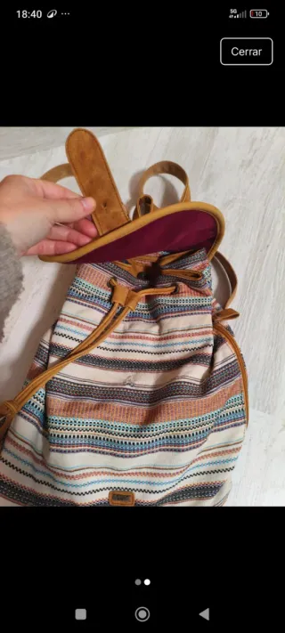 Mochila con un diseño étnico y juvenil. - Solapa de polipiel. - Cierre de cordón ajustable. - Bolsillo exterior con botón. - Tiras de hombro regulables.