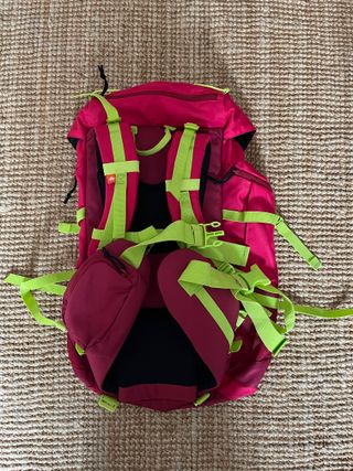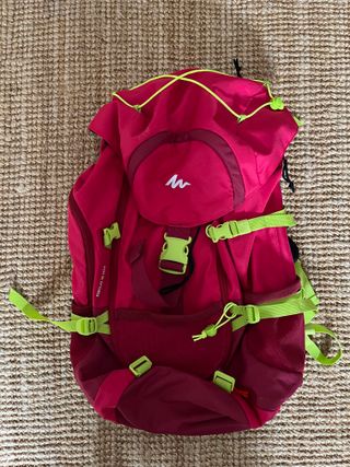 Mochila Forclaz 40 Teen de Decathlon, ideal para excursiones. - Color rosa y rojo. - Diseño juvenil y práctico.
