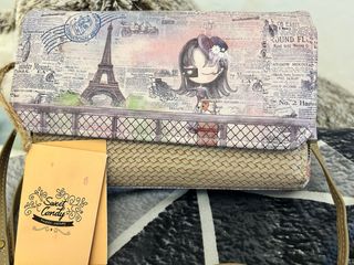 Cartera con un diseño juvenil y encantador, inspirada en París y la Torre Eiffel. Ideal para llevar tus esenciales con estilo. - Estampado de periódico vintage con la Torre Eiffel. - Detalle de personaje con cámara. - Cierre de solapa. - Material de base tejido.