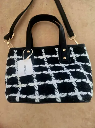 Bolso de tela con un diseño juvenil y moderno, perfecto para el día a día. - Estampado de cuadros en blanco y negro. - Asas de mano y correa ajustable. - Etiqueta de marca visible.