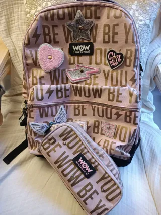 Conjunto de mochila y neceser con un diseño divertido y juvenil. - Mochila con estampado BE YOU y WOW GENERATION. - Incluye varios parches decorativos como estrellas, corazones y Girl Power. - Neceser a juego con el mismo estampado. - Cierre de cremallera en ambos artículos.