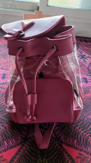 Bolso mochila con un diseño moderno y juvenil, combinando material transparente con detalles en color rosa. - Compartimento principal con cierre de cordón. - Bolsillo frontal con cremallera. - Asa superior y correas ajustables. - Logo triangular metálico en la solapa.
