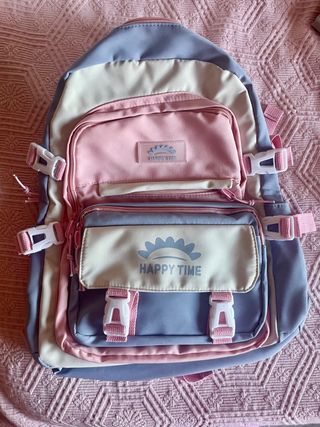Mochila con un diseño alegre y juvenil, perfecta para el día a día. - Estampado Happy Time con sol. - Múltiples compartimentos y bolsillos. - Cierres de clip y cremallera. Nunca ha sido usada.