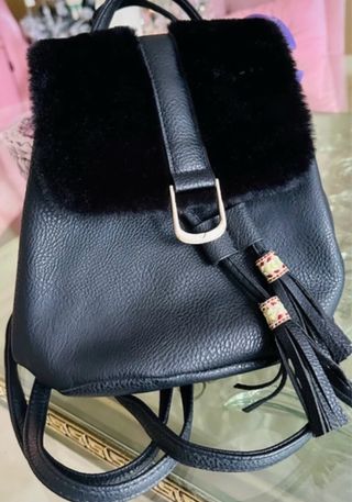Mochila juvenil con un diseño moderno y detalles únicos. - Acabado en material texturizado. - Adorno de pelo sintético en la solapa. - Dos borlas decorativas con detalles dorados y rojos.