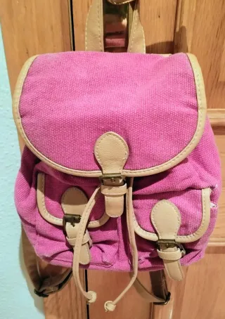 Mochila de tela en color rosa con un diseño juvenil y práctico. Cuenta con detalles y acabados en piel sintética que le dan un toque especial. - Cierre principal con solapa y hebilla. - Dos bolsillos frontales con cierre de hebilla. - Tirantes ajustables.