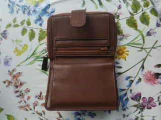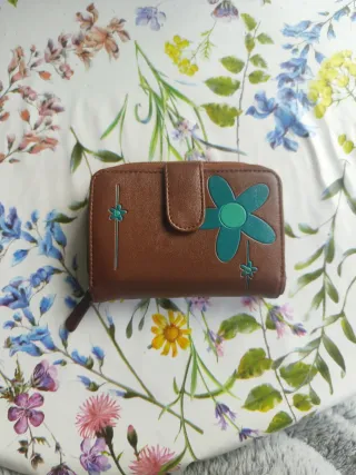 Cartera juvenil marrón con un diseño floral y de tacto suave y agradable. - Cierre de cremallera para monedas. - Billetera separada. - Múltiples compartimentos para tarjetas, fotos...