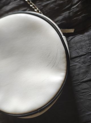 Precioso bolso redondo de Primark, en blanco y negro. Es pequeño y perfecto para llevar lo esencial. Tiene un diseño juvenil con parches. - Asa con cadena metálica. - Cierre de cremallera. - Presenta pequeños arañazos en la parte trasera que no se aprecian una vez puesto, de ahí su precio.