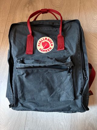 Mochila Fjallraven Kanken en color gris. Un clásico versátil y duradero. 38 cm (16L) - Compartimento principal con cierre. - bolsillo especial para ordenador portatil de hasta 15” - Bolsillo frontal con cremallera. - Asas superiores y correas ajustables. con señales de uso pero en perfecto estado