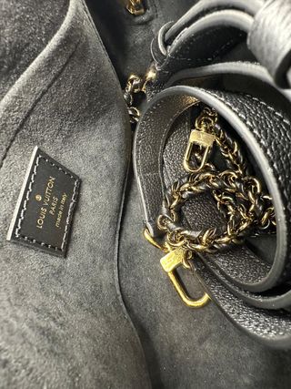 Bolso Louis Vuitton Montaigne MM original en piel Empreinte negra. Modelo elegante y funcional con el icónico monograma grabado en relieve. Interior forrado en microfibra burdeos con bolsillos y compartimentos. Incluye bandolera extraíble y candado dorado con su funda original. Medidas: 36x22x10 cm. Ideal como bolso de diario o para trabajar con estilo. Estado: muy bueno, tanto por fuera como por dentro. Sin desgastes visibles. Oportunidad única para conseguir un bolso de lujo Louis Vuitton de segunda mano en excelente estado y con todos sus accesorios originales. Entrega en mano en Barcelona o envío. Ref. 0422