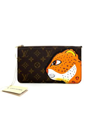 Pochette Louis Vuitton con el icónico estampado Monogram y un diseño de animal. - Estampado Monogram. - Detalle de animal en naranja y blanco.