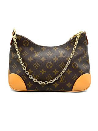 Bolso Louis Vuitton Boulogne MM en lona Monogram con esquinas de piel natural. Incluye cadena dorada de mano y correa larga de piel ajustable. Interior textil en burdeos con bolsillo plano. Medidas: 29x18x9 cm. En excelente estado. Ref. BCN 0436 – Disponible en Barcelona