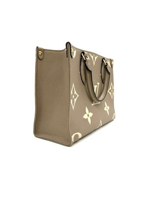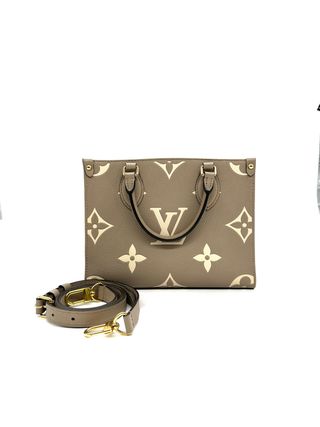 Bolso Louis Vuitton OnTheGo PM de segunda mano en piel Monogram Empreinte bicolor, en tono topo con motivo monograma en beige. Un modelo compacto y funcional de la línea Louis Vuitton OnTheGo, con doble asa superior y bandolera ajustable y desmontable para llevar al hombro o cruzado. Sus medidas de 24 x 19 x 10 cm lo convierten en una opción ideal para uso diario con estilo. En excelente estado, sin signos visibles de uso. Una oportunidad única para adquirir un bolso Louis Vuitton OnTheGo PM original de segunda mano con un diseño actual y sofisticado. Barcelona 0610