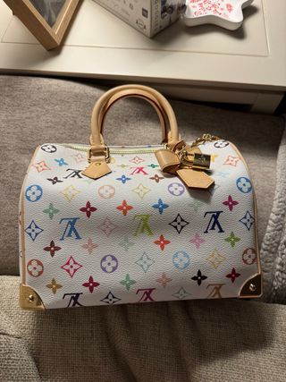 Bolso Louis Vuitton con un diseño vibrante y alegre. - Estampado icónico multicolor sobre fondo blanco. - Detalles en piel natural. - Cierre de cremallera. - Incluye candado y llaves.