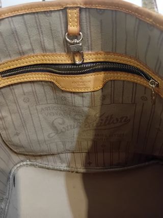 Bolso original Neverfull mediano en color beige. - Interior forrado en tela. - Bolsillo interior con cremallera. - Cierre superior de gancho. - Detalles en piel. - Fabricado en Francia. Ha sido restaurado una vez, parcial, toca otra restauración.
