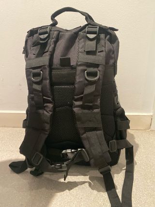 Mochila de estilo militar con múltiples compartimentos y bolsillos. - Diseño con correas MOLLE para añadir equipo. - Bolsillos laterales de malla. - Cremalleras resistentes. Mide unos 40 y algo cm de largo y 37 o asi de ancho.