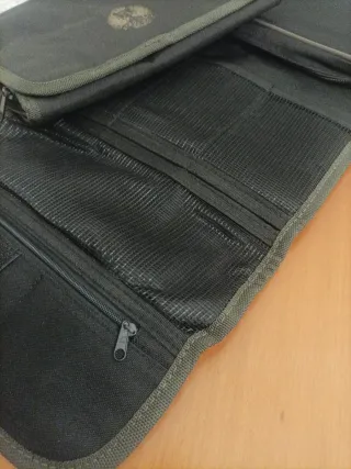 Neceser de estilo militar con múltiples compartimentos para organizar tus pertenencias. - Diseño plegable. - Compartimentos interiores de malla. - Un bolsillo transparente.