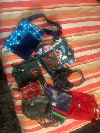 Conjunto de nueve bolsos de diferentes estilos y diseños. - Un bolso azul con lunares blancos. - Un bolso con estampado geométrico en tonos verdes y rosas. - Un bolso negro de cuero. - Un bolso verde militar. - Un bolso pequeño con bordados rojos y dorados. - Un bolso redondo negro. - Un bolso azul marino con detalles de rayas verdes y rojas. - Un bolso rojo. - Un bolso de tela con estampado de círculos.