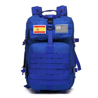 Mochila táctica de gran capacidad, ideal para actividades al aire libre o uso militar. Incluye dos parches decorativos. - Capacidad de 50 litros. - Color azul marino. - Dos parches incluidos: bandera de España y bandera de Estados Unidos.