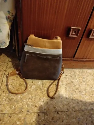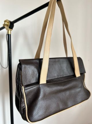 Bolso MISAKO en color marrón, diseño elegante y muy combinable. Tiene un interior amplio con varios compartimentos, ideal para llevar todo lo necesario en el día a día. Características: - Asas de mano cómodas - Bandolera ajustable y desmontable - Cierre superior con cremallera - Interior con bolsillos (uno con cremallera) - Material tipo piel, suave y resistente - Herrajes dorados - Diseño estructurado que mantiene la forma En excelente estado.