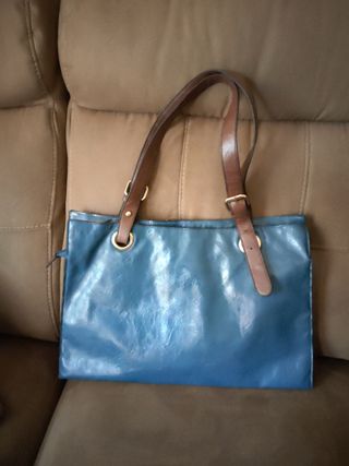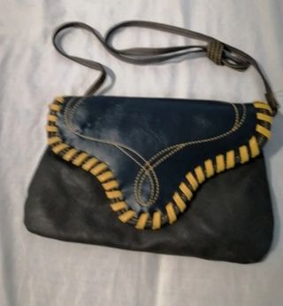 Bolso de asas grandes (se puede llevar tipo sobre o con la asa en el hombro) , color gris con azul oscuro y detalles en amarillo . Medidas 27 cm X 18 cm , de la marca Misako . Está en buen estado general , pero le ha quedado una marca de una cadena de otro bolso , como se ve en la última foto .