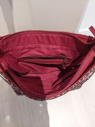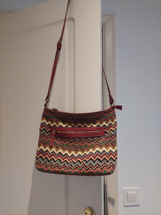 Precioso bolso bandolera de estilo étnico. Ideal para el día a día. - Diseño con estampado multicolor tonos tierra. - Asa bandolera de piel marrón ajustable. - Cierre de cremallera. - Compartimento interior con bolsillo.