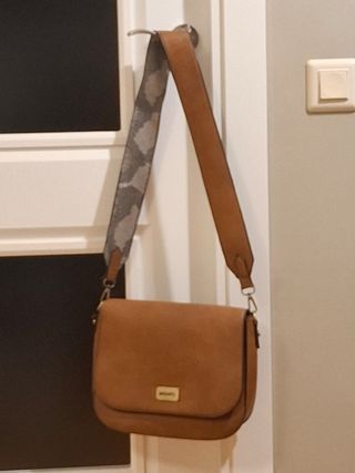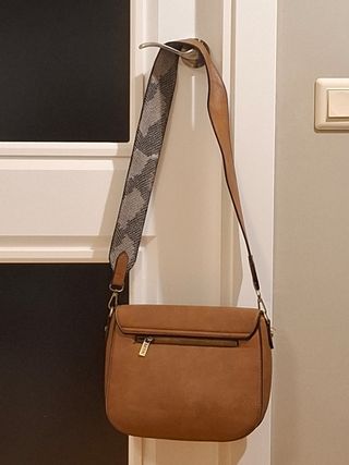 Bolso de mano o de hombro de la marca Misako. - Color marrón. - Correa ajustable con estampado. - Detalle metálico en la solapa. - Bolsillo trasero con cremallera. - Bolsillo interior.
