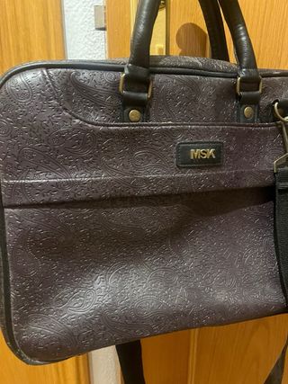 Maletín de estilo clásico con un diseño grabado en color violeta. Tiene algunos desperfectos. - Asa superior para llevar en mano. - Correa ajustable para colgar al hombro. - Placa metálica con las iniciales MSK.