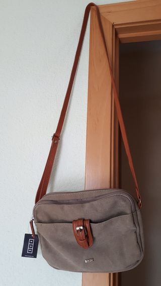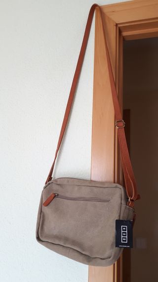Bolso Bandolera de lona, cómodo de llevar, regulable en altura. Color entre beige oscuro marrón claro. De cuatro compartimentos, tres con cremallera y uno con imán. Consta también de copartimiento interno con cremallera. Ver detalles en fotos. Medidas 28 largo y 20 de alto, aproximadamente. Se entrega en mano.