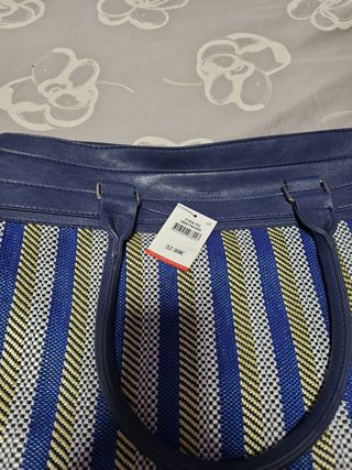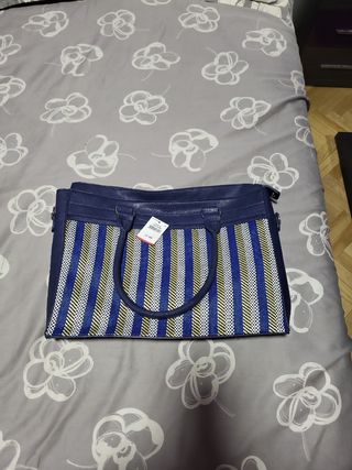 Precioso bolso de mano, ideal para el día a día. Es de color azul y amarillo, con un diseño a rayas. - Asa de mano. - Diseño elegante y moderno. - Perfecto para llevar tus cosas.