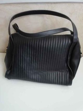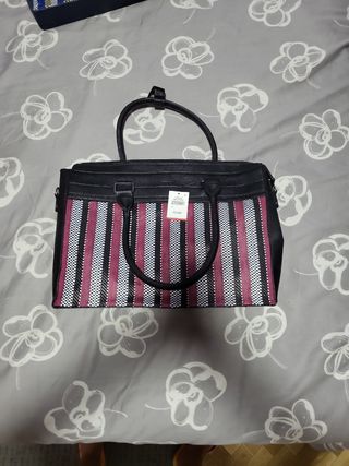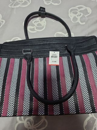 Elegante bolso de mano, ideal para llevar tu portátil. Es de color negro con rayas rosas. - Diseño a rayas. - Asa de mano. - Perfecto estado.