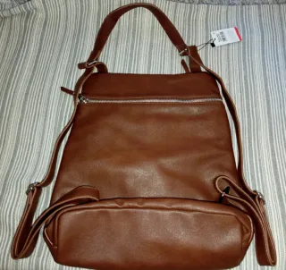 Bolso versátil que se puede usar como mochila. Confeccionado en material de imitación piel. - Cierre principal con cremallera. - Solapa frontal con hebilla decorativa. - Correas ajustables para llevar como mochila. - Asa superior para llevar como bolso.