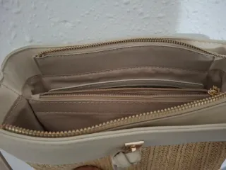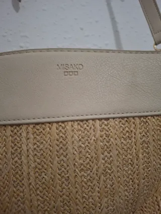 Bolso de la marca Misako en color beige. Combina un diseño elegante con materiales de calidad. - Material exterior de rafia. - Detalle de asa y ribete en piel sintética. - Incluye varios compartimentos y se divide en dos secciones