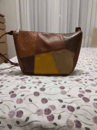 Bolso de piel con diseño patchwork. - Combinación de texturas y tonos. - Cierre de cremallera. - Correa ajustable.