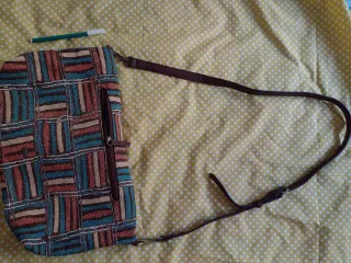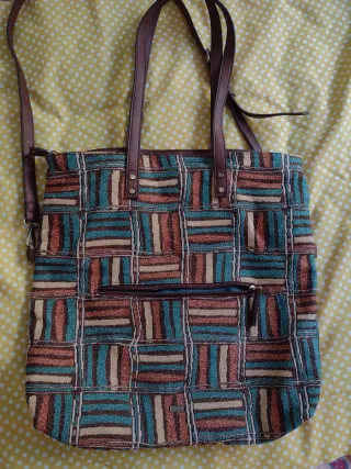 Bolso de mano y hombro con un diseño geométrico muy llamativo. - Asa de mano y correa para colgar. - Bolsillo exterior con cremallera. - Estampado de cuadros en tonos marrones, turquesas y beige. No ha sido usado.