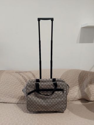 Maleta de viaje nueva todavía lleva el plástico protector. Conserva ticket de compra original, lleva un golpe en un lateral. - Cuatro ruedas para facilitar el transporte en perfecto estado. - Color plateado.