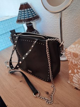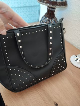 Maletín espacioso con asa y cinta para llevar. - Diseño con tachuelas doradas en la parte lateral. - Asa superior y cinta bandolera ajustable.