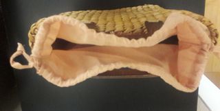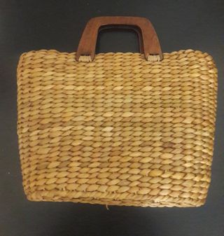 Precioso bolso de verano de la marca Misako. Es de color beige y marrón, con un diseño tejido muy bonito. - Asa de madera. - Forro interior de color melocotón. - Ideal para tus días de verano.