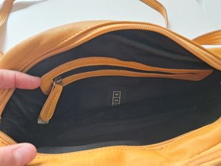 Bolso de mano o bandolera de la marca Misako. Tiene muchos bolsillos con cremallera. - Color mostaza. - Tamaño mediano. - Cierre con hebilla.