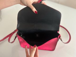 Bolso de la marca Misako en un llamativo color rosa. - Acabado brillante. - Cierre con hebilla dorada. - Correa ajustable.