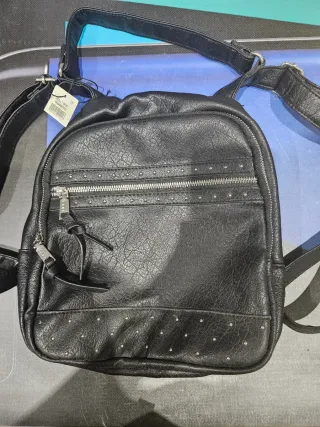 Mochila Misako de estilo moderno, antirobo, el bolsillo principal queda a la parte interior de la mochila (a la espalda). Totalmente nueva y con etiqueta. ATENDED A LAS MEDIDAS, ya que es un modelo más pequeño de lo habitual en Misako. - Diseño en piel sintética. - Adornada con tachuelas metálicas. - Cierre de cremallera. Medidas: Altura: 28 cm Largo: 24 cm Ancho: 8 cm