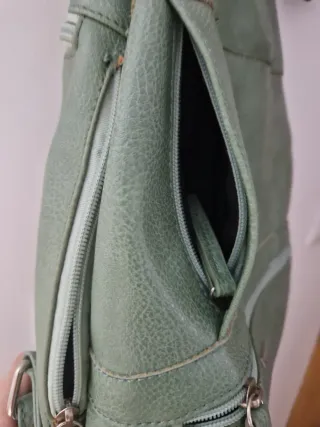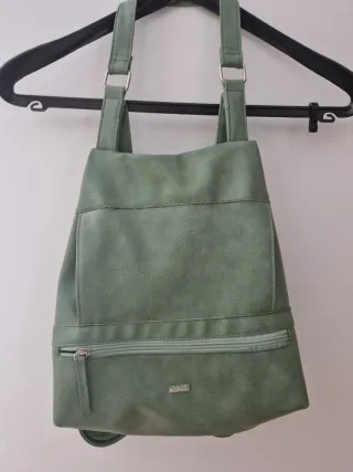 Bolso tipo mochila en color verde. Tiene un diseño moderno y práctico. Tiene un par de desperfectos y un agujero en el bolsillo interior de delante - Compartimento frontal con cremallera. - Cierre principal con cremallera. - Detalle de logo en la parte frontal.