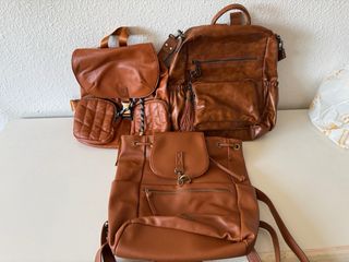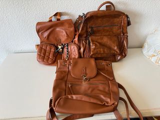 Conjunto de tres mochilas de polipiel. - Diseño moderno y práctico. - Material: Polipiel. - Color: Marrón.