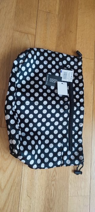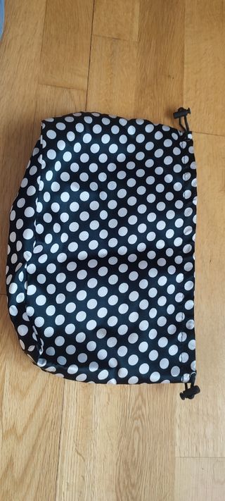 Organizador tipo bolsa de la marca Misako. Es una pieza elegante y práctica, ideal para llevar tus objetos personales. - Diseño de lunares blancos sobre fondo negro. - bolsillo de cremallera. - Cordón para ajustar el tamaño.