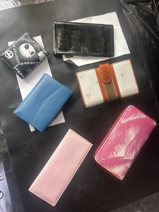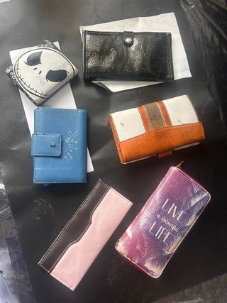 Cinco carteras de diferentes estilos y colores. - Cartera con diseño de Jack Skellington. - Cartera negra con relieve. - Cartera azul con detalle. - Cartera bicolor con marrón y blanco. - Cartera con estampado de palmeras y texto 'LIVE a colourful LIFE'.