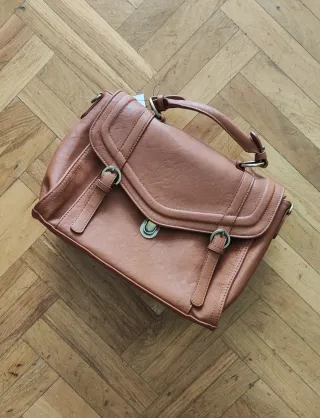 Bolso tipo satchel en color camel con detalles dorados de Misako. Bolsillo en la parte posterior y varios interiores. Cinta larga ajustable y removible. Está con la etiqueta, pero tiene un pequeño defecto en la parte de atrás de estar guardando (cuarta foto).