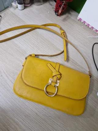 Bandolera en color mostaza. Tiene un diseño moderno y práctico. Tiene dos bolsillos principales y uno de cremallera interior. - Cierre con solapa. - Detalle de aro metálico y nudo. - Correa ajustable.