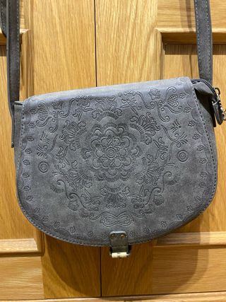 Bolso bandolera de color gris con un bonito grabado. - Diseño con solapa. - Cierre de hebilla. - Correa ajustable. Tiene marcas de desgaate
